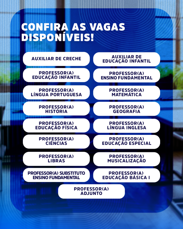 O processo contempla oportunidades para funções como Auxiliar de Creche, Auxiliar de Educação Infantil e professores da Educação Infantil e do Ensino Fundamental, abrangendo diferentes áreas do conhecimento, entre elas Língua Portuguesa, Matemática, História, Geografia, Educação Física, Educação Artística, Língua Inglesa, Ciências, Educação Especial, Libras e Musicalização.